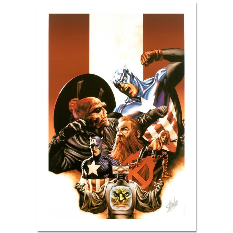 "Captain America #42" is a limited edition giclee on canvas with art by Steve Epting. Officially licensed by Marvel, this piece is numbered 6/10 and hand signed by creative legend Stan Lee (1922-2018). The piece comes with a certificate of authenticity. Measures approximately 27" x 18".