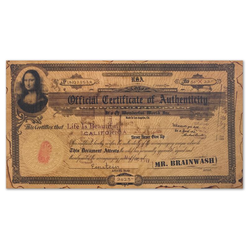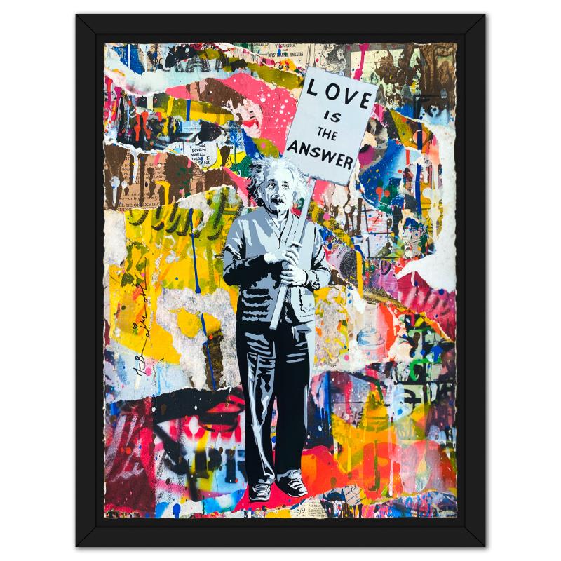 Einstein is a unique (UNQ) mixed media on deckle edge paper by Mr Brainwash, Hand Signed and thumbprinted inverso by the artist. This piece comes custom framed. Includes Certificate of Authenticity. Measures approx. 34" x 26" (frame), 30" x 22" (image).This item requires special handling and may have longer than usual turnaround.