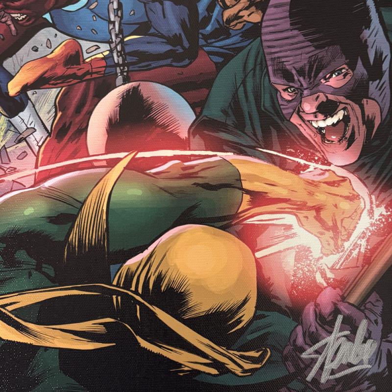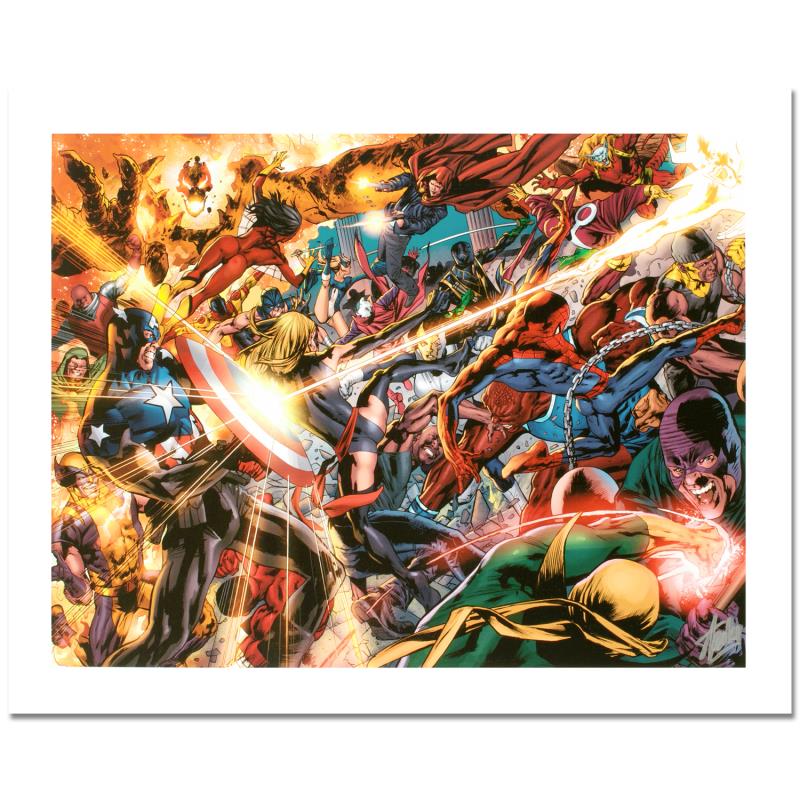 "New Avengers #50" is a limited edition giclee on canvas with art by Billy Tan . Officially licensed by Marvel, this piece is numbered 3/10 and hand signed by creative legend Stan Lee (1922-2018). Refer to second image for the signature as it appears on this piece. The piece comes with a certificate of authenticity. Measures approximately 18" x 24".