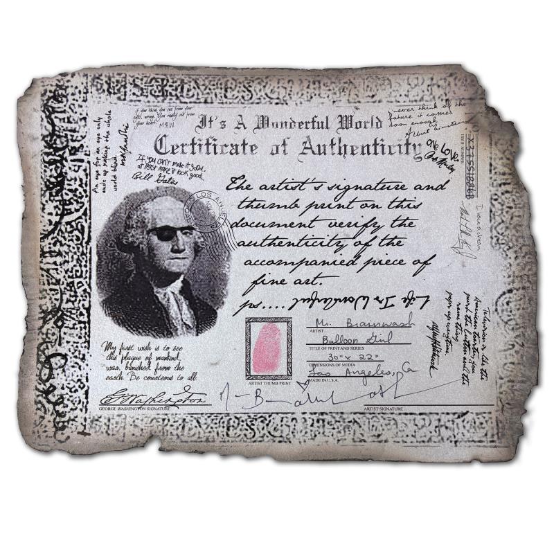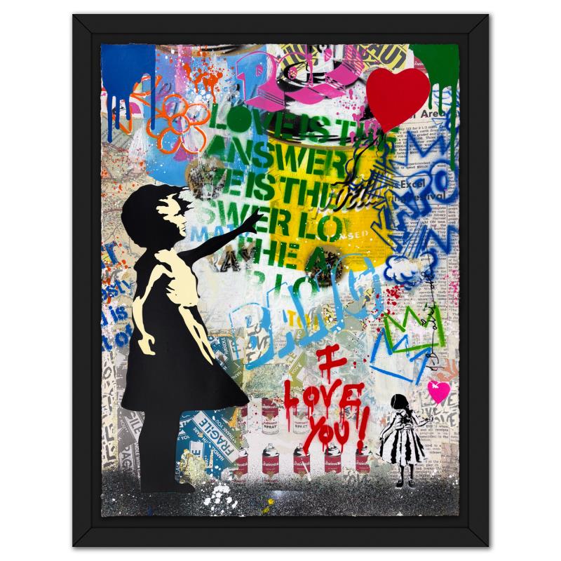"Ballon Girl" is a mixed media original on deckle edge paper by Mr Brainwash, hand signed and thumbprinted inverso by the artist. This piece comes custom framed. Includes Certificate of Authenticity. Measures approx. 34" x 26" (frame), 30" x 22" (image).This item requires special handling and may have longer than usual turnaround.