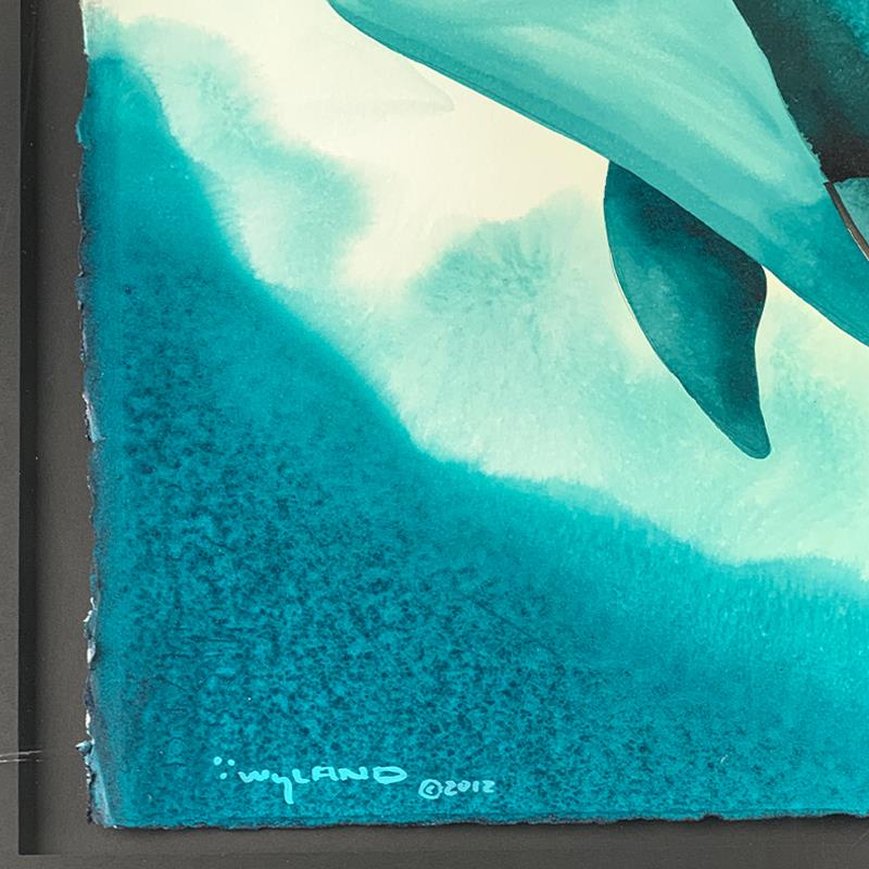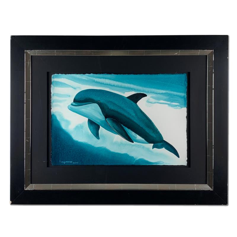 "Dolphin Realm" is a framed original painting on paper by Wyland. Hand signed by the artist, this piece comes with a letter of authenticity. The frame shows notable wear and may need to be replaced. Measures approx. 28" x 36" (framed), 15" x 23" (image).