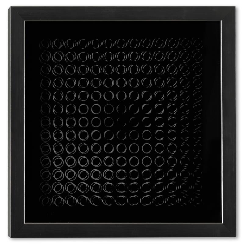 "Trois Dimensions Optique de la série Cinetiques" is a dimensional artwork, published in 1973, by Victor Vasarely (1908-1997). This piece comes custom framed, with a letter of authenticity and with a 1976 Vasarely paperback. Measures approx. 11.5" x 11.5" (frame), 9" x 9" (image). This item requires special handling and may have a longer than usual turnaround.