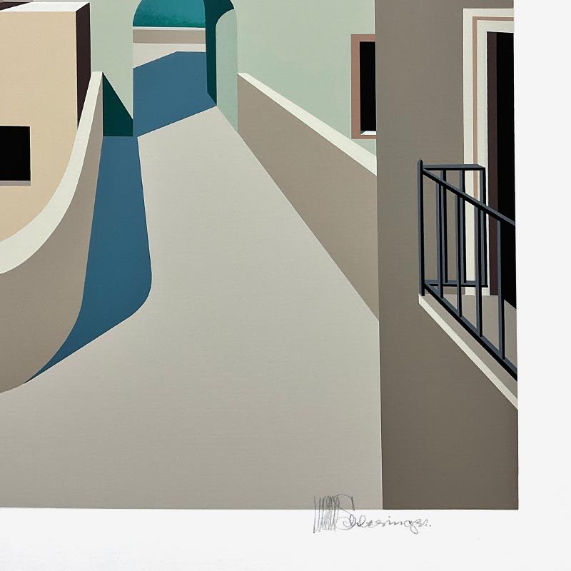 "Overpass" is a limited edition serigraph on paper by William Schlesinger (1915-2011), numbered 11/295 and hand signed by the artist. Includes Letter of Authenticity. Measures approx. 33.5" x 30" (border), 28.5" x 24" (image). There is a crease on the bottom-right corner that may be concealed when the piece is framed.