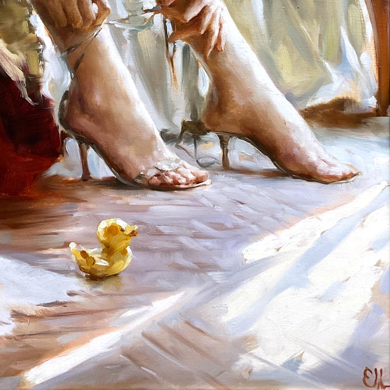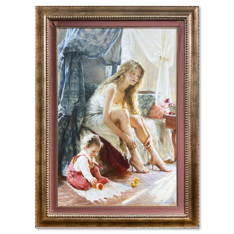 "Playtime - Morning Light" is an original oil painting on canvas by Katya Morgun, hand signed by the artist. This piece comes framed. Includes Letter of Authenticity. Measures approx. 57.5" x 42" (frame), 46" x 30" (image). There is some wear on the frame.