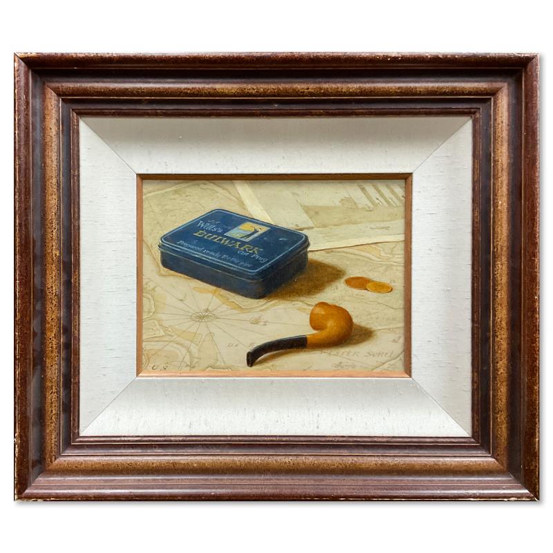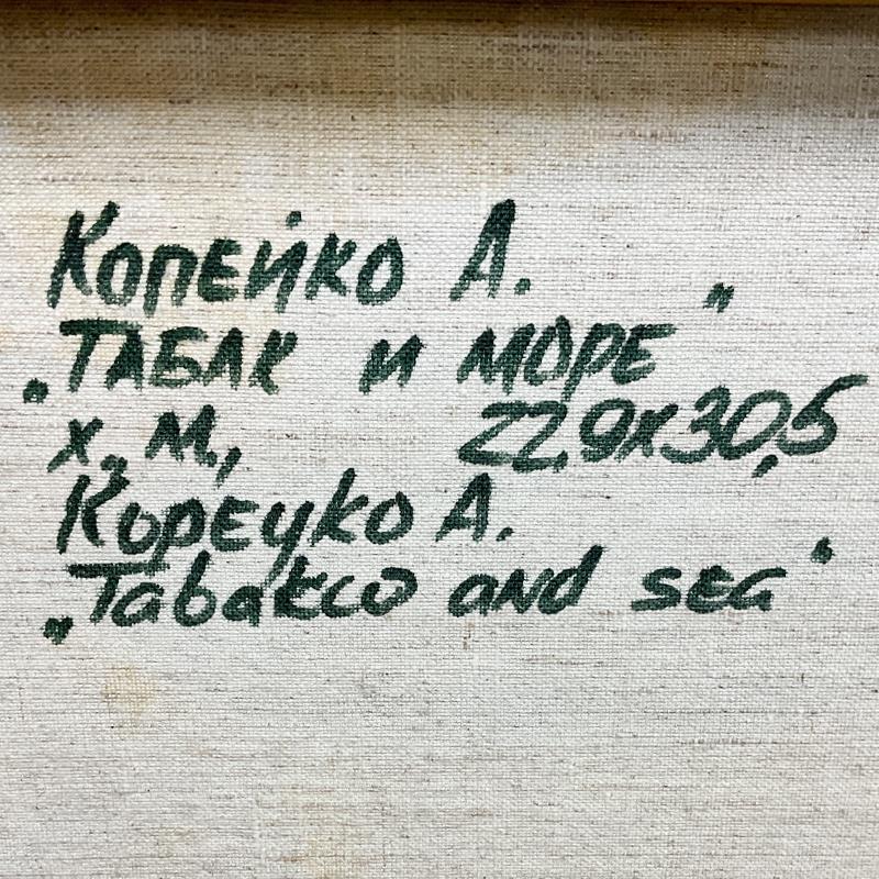 "Tobacco and Sea" is an original oil painting on canvas by Alexander Kopeyko, hand signed by the artist. This piece comes framed. Includes Letter of Authenticity. Measures approx. 17.5" x 20.5" (frame), 8" x 11" (image). There is some wear on the frame.