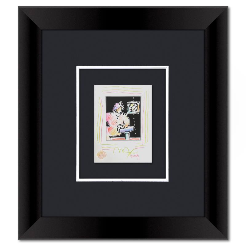 This is a one-of-a-kind mixed media on paper, hand signed by Peter Max. The piece comes custom framed with a backside cutout to display Peter Max Studio registration number 339484 certifying authenticity. Measures approximately 22.5" x 20" (frame), 8.5" x 6" (image). This item requires special handling and may have a longer than usual turnaround.
