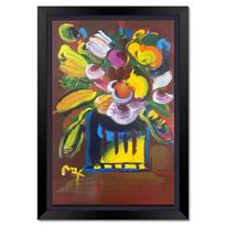 "2 Liberties, Flag and Heart" is a one-of-a-kind mixed media on paper, hand signed by Peter Max. The piece comes custom framed with a backside cutout to display Peter Max Studio registration number 281368 certifying authenticity. Measures approximately 28" x 24" (frame), 19" x 15" (image). This item requires special handling and may have a longer than usual turnaround.