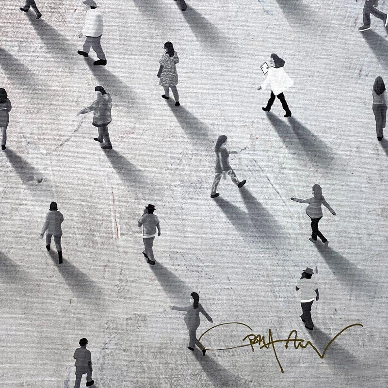 One of Alan’s notable series, "Populus," features intricate paintings of tiny people forming iconic images. This work showcases characters from diverse walks of life, demonstrating a broad spectrum of character and body types through brilliant use of posture and movement. The figures in Alan’s "Populus" series are meticulously arranged to create larger, recognizable images, highlighting his inventive approach and the thematic exploration of individual versus collective identity??.