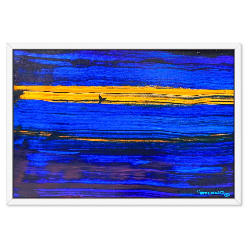 "Whale Tail" is an original acrylic painting on canvas by Wyland, hand signed by the artist. This piece comes custom framed. Includes Letter of Authenticity. Measures approx. 29.5" x 41.5" (frame), 28" x 40" (image). This item requires special handling and may have a longer than usual turnaround.