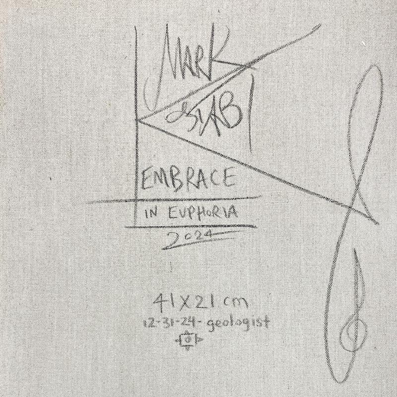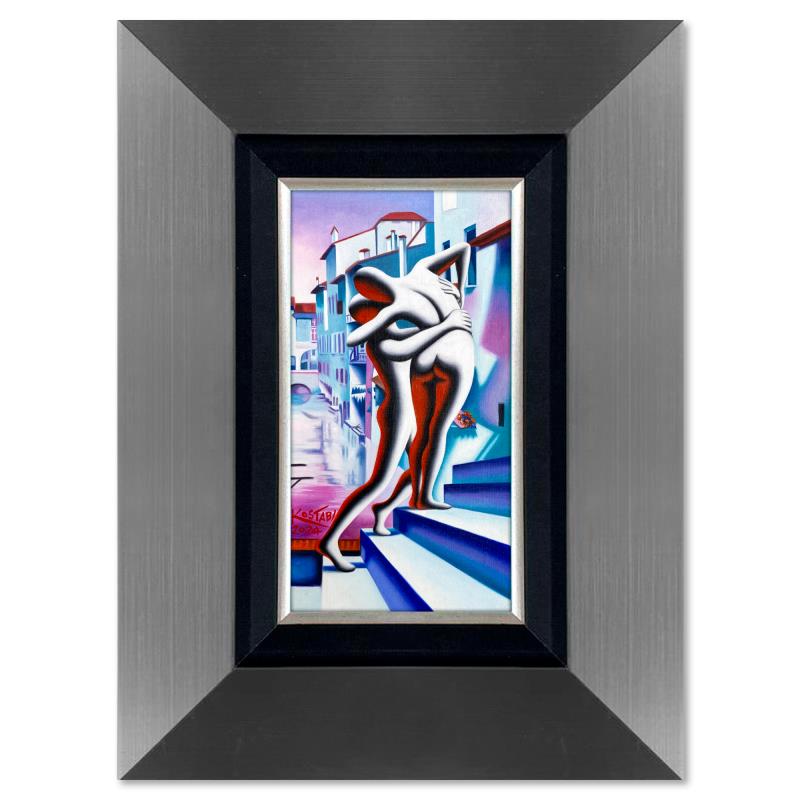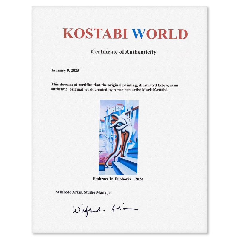 "Embrace In Euphoria"is an original oil painting on canvas by Mark Kostabi, hand signed by the artist. This piece comes custom framed. Includes Certificate of Authenticity. Measures approx. 26" x 19" (frame), 16" x 9" (image). This item requires special handling and may have a longer than usual turnaround.