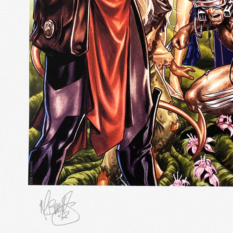 "House of X" is a limited edition giclee on paper from Marvel Comics and Mark Brooks, PP numbered 3/4 and bearing the authorized signature of the artist. Includes Letter of Authenticity. Measures approx. 18" x 24" (border) 14" x 20" (image).