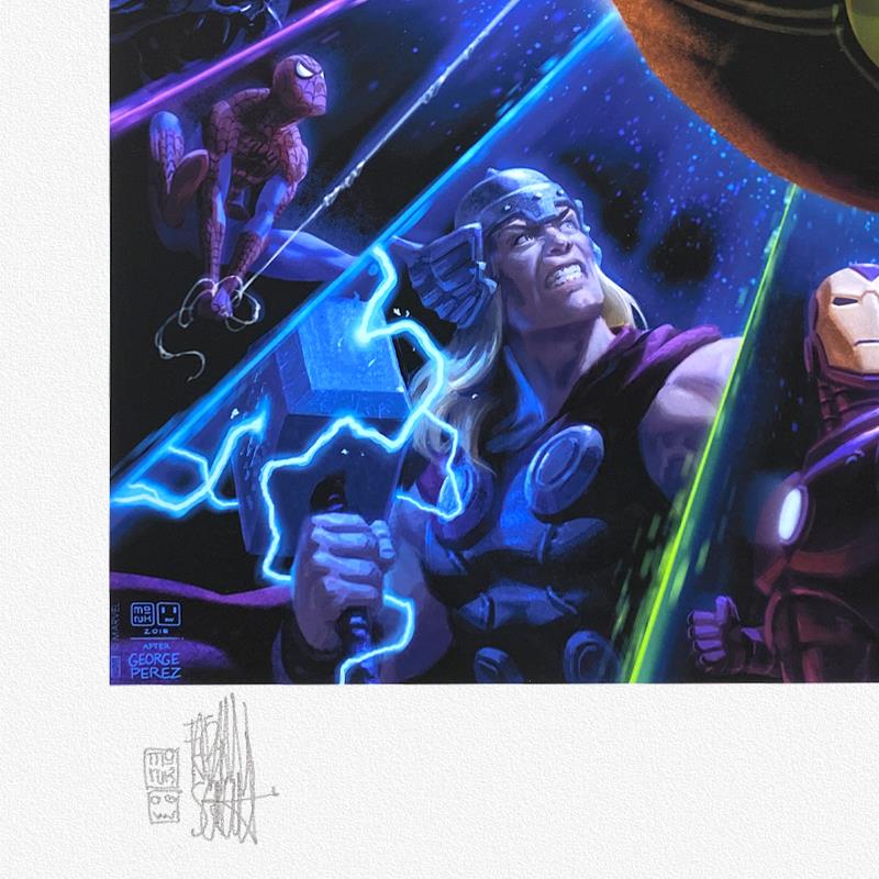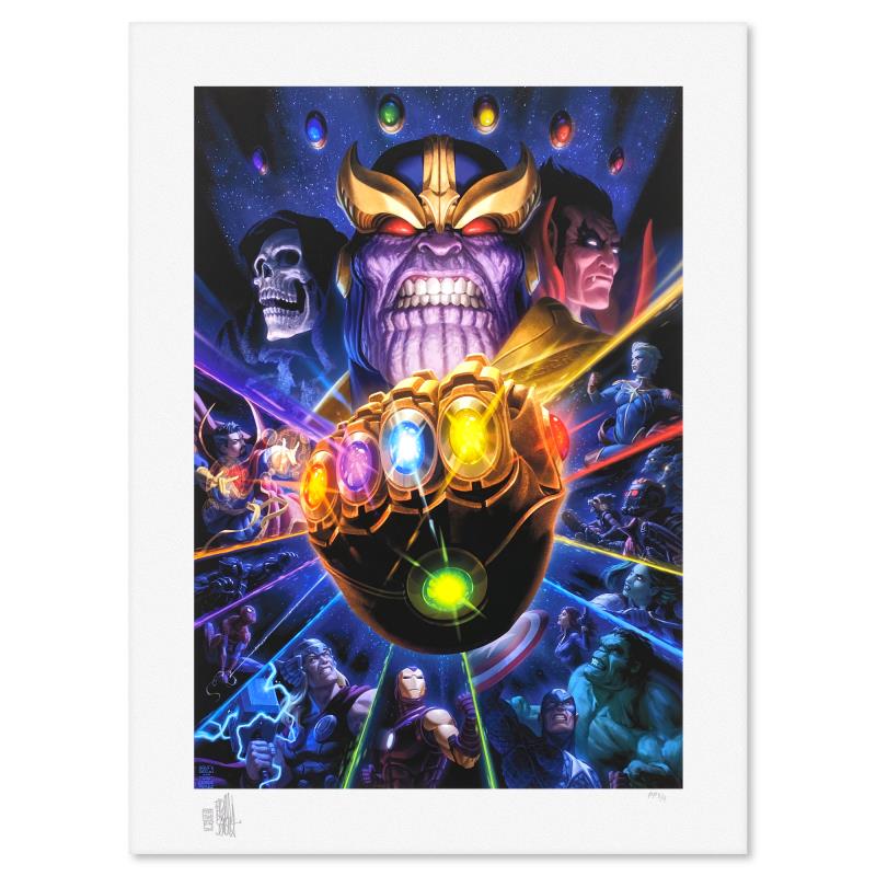 "Thanos & Infinity Gauntlet" is a limited edition giclee on paper from Marvel Comics and Fabian Schlaga, PP numbered 3/4 and bearing the authorized signature of the artist. Includes Letter of Authenticity. Measures approx. 24" x 18" (border) 20" x 14" (image).