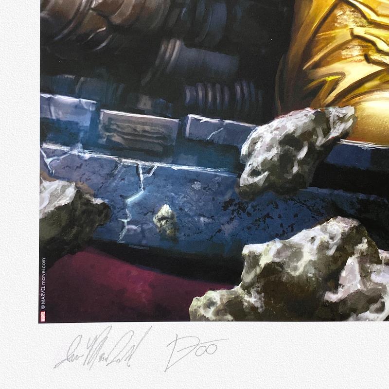 "Thanos on Throne" is a limited edition giclee on paper from Marvel Comics, Doo-Chun and Ian MacDonald, PP numbered 3/4 and bearing the authorized signature of the artists. Includes Letter of Authenticity. Measures approx. 24" x 18" (border) 20" x 14" (image).