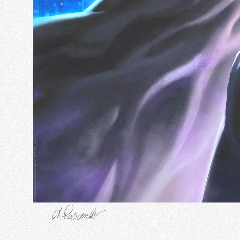 "Batman & Catwoman" is a limited edition giclee on paper from DC Comics and Alex Pascenko, PP numbered 3/4 and bearing the authorized signature of the artist. Includes Letter of Authenticity. Measures approx. 24" x 18" (border) 20" x 14" (image).