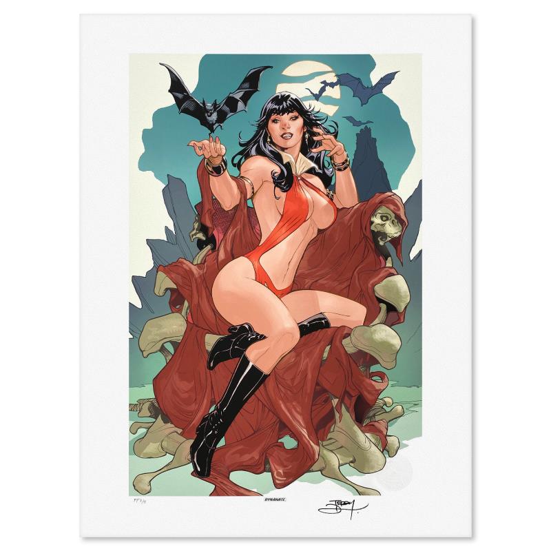 "Vampirella A Scarlet Thirst" is a limited edition giclee on paper by Terry and Rachel Dodson, PP numbered 3/4 and bearing the authorized signature of the artists. Includes Letter of Authenticity. Measures approx. 24" x 18" (border) 20" x 14" (image).