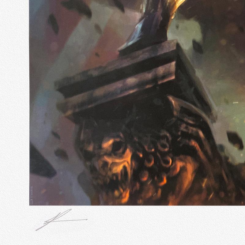"Doctor Doom" is a limited edition giclee on paper from Marvel Comics and Richard Luong, PP numbered 3/4 and bearing the authorized signature of the artist. Includes Letter of Authenticity. Measures approx. 24" x 18" (border) 20" x 14" (image).