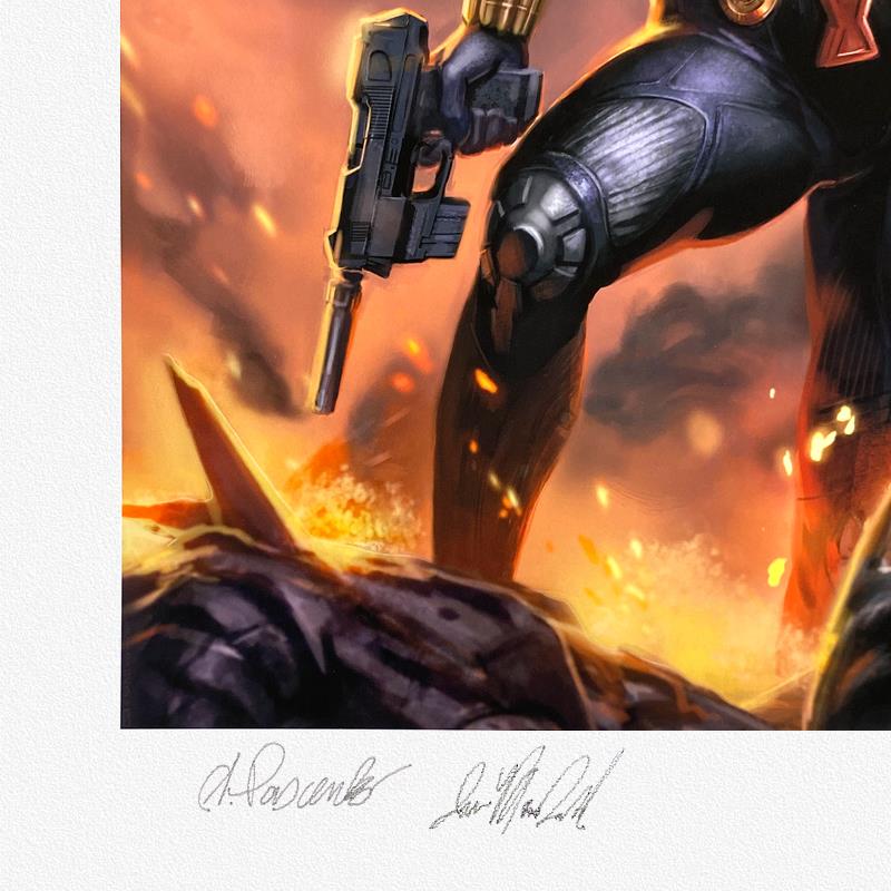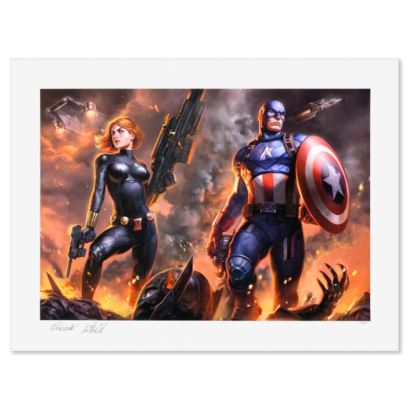 "Captain America and Black Widow" is a limited edition giclee on paper from Marvel Comics, Alex Pascenko and Ian MacDonald, PP numbered 3/4 and bearing the authorized signature of the artist. Includes Letter of Authenticity. Measures approx. 18" x 24" (border) 14" x 20" (image).