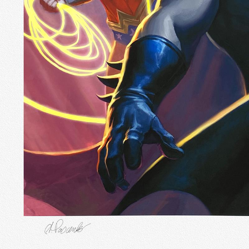 "Justice League Trinity" is a limited edition giclee on paper from DC Comics and Alex Pascenko, PP numbered 3/4 and bearing the authorized signature of the artist. Includes Letter of Authenticity. Measures approx. 24" x 18" (border) 20" x 14" (image).
