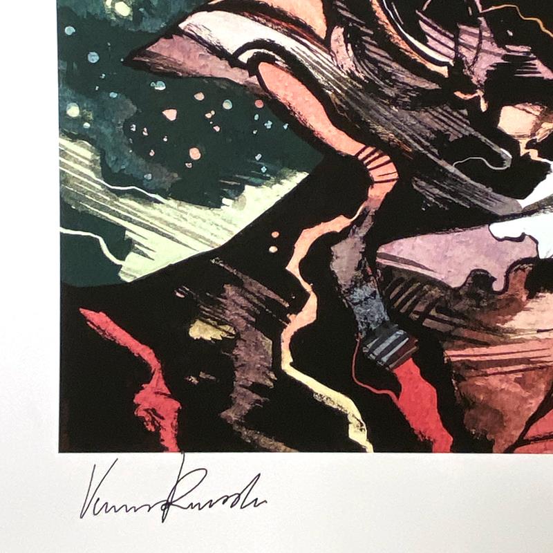 "Star-Lord" is a limited edition giclee on paper from Marvel Comics and Vincenzo Riccardi, PP numbered 3/4 and bearing the authorized signature of the artist. Includes Letter of Authenticity. Measures approx. 24" x 18" (border) 20" x 14" (image).