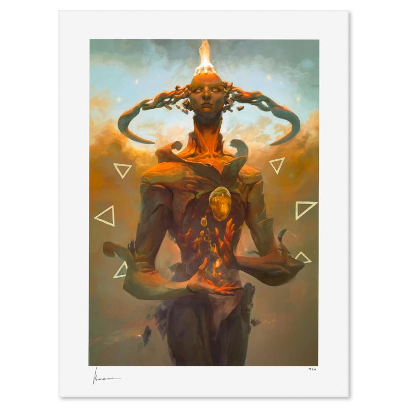 "Tiferet: Emanation of Beauty" is a limited edition giclee on paper by Peter Mohrbacher, PP numbered 3/4 and bearing the authorized signature of the artist. Includes Letter of Authenticity. Measures approx. 24" x 18" (border) 20" x 14" (image).