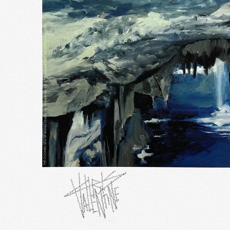 "The Goonies Never Say Die" is a limited edition giclee on paper by Chris Valentine, PP numbered 3/4 and bearing the authorized signature of the artist. Includes Letter of Authenticity. Measures approx. 24" x 18" (border) 20" x 14" (image).
