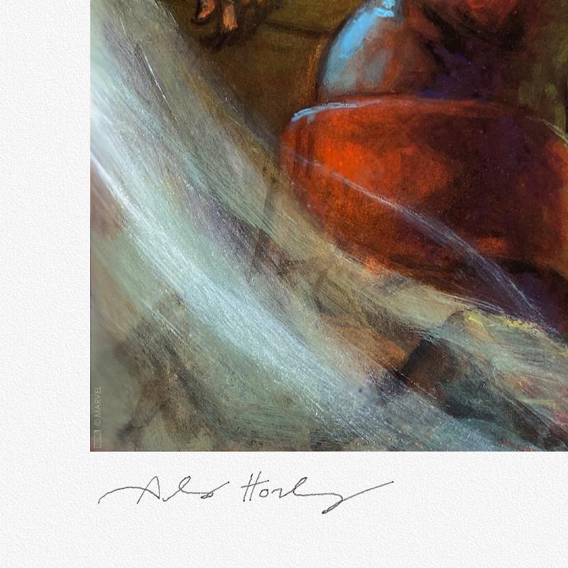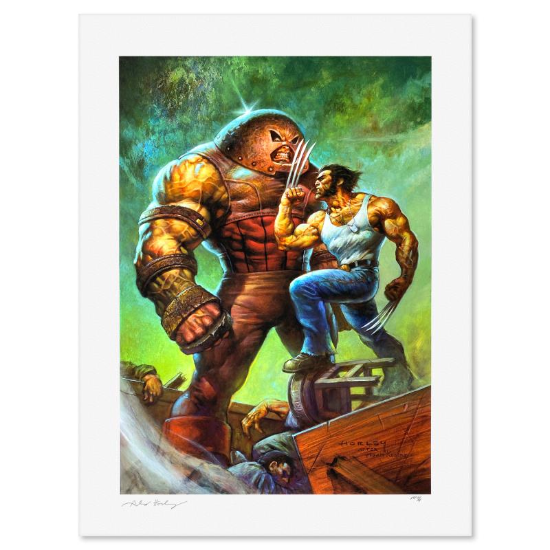 "Juggernaut VS Wolverine" is a limited edition giclee on paper from Marvel Comics and Alex Horley, PP numbered 3/4 and bearing the authorized signature of the artist. Includes Letter of Authenticity. Measures approx. 24" x 18" (border) 20" x 14" (image).