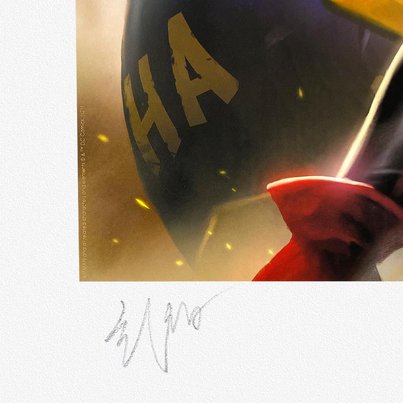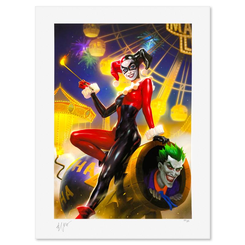 "Harley Quinn & The Joker" is a limited edition giclee on paper by Heonhwa Choe, PP numbered 3/4 and bearing the authorized signature of the artist. Includes Letter of Authenticity. Measures approx. 24" x 18" (border) 20" x 14" (image).