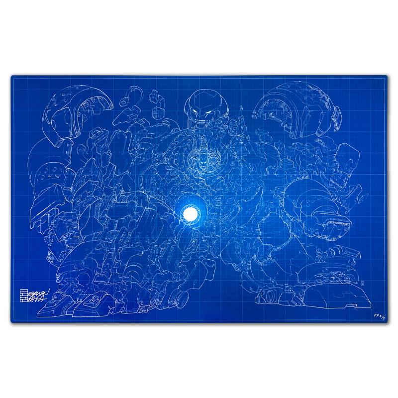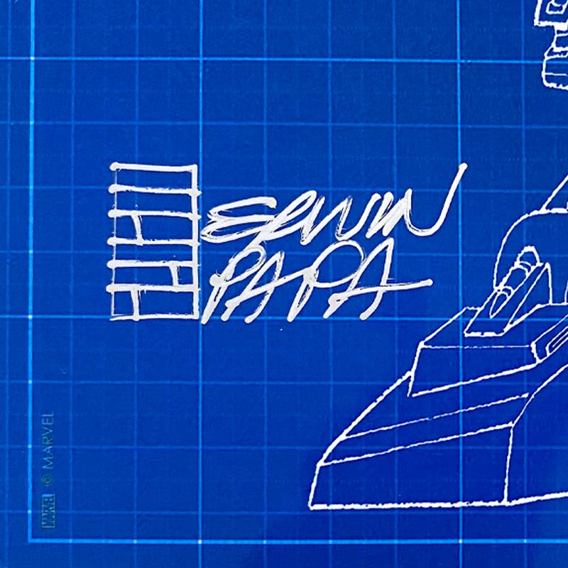 "Hulkbuster Blueprint Variant" is a limited edition giclee on aluminum from Marvel Comics and Erwin Papa, PP numbered 3/4 and bearing the authorized signature of the artist. Includes Letter of Authenticity. Measures approx. 16" x 24" (image).
