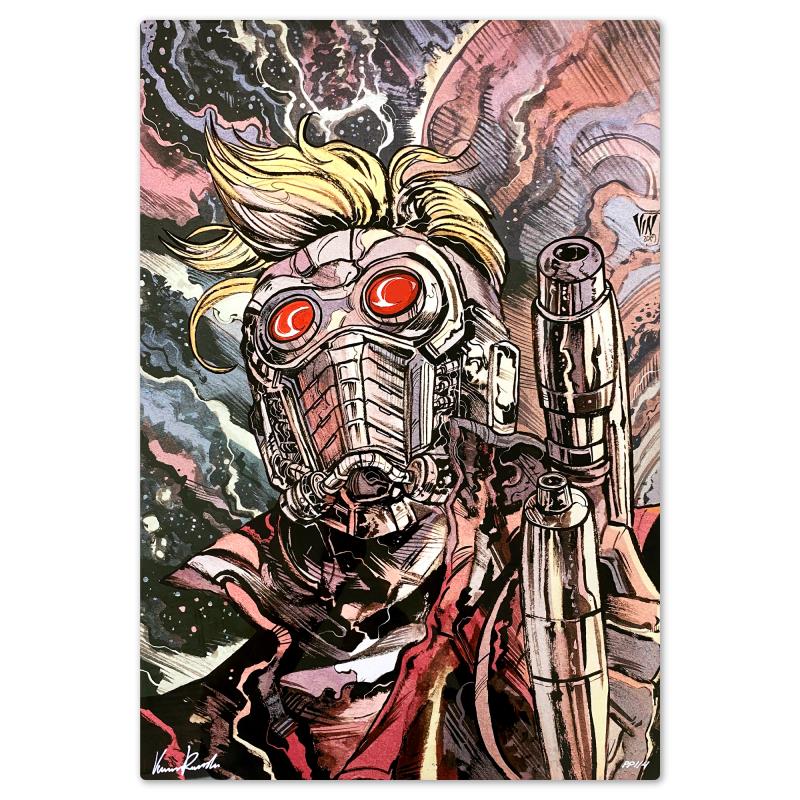"Star-Lord" is a limited edition giclee on aluminum from Marvel Comics and Vincenzo Riccardi, PP numbered 1/4 and bearing the authorized signature of the artist. Includes Letter of Authenticity. Measures approx. 24" x 16" (image).