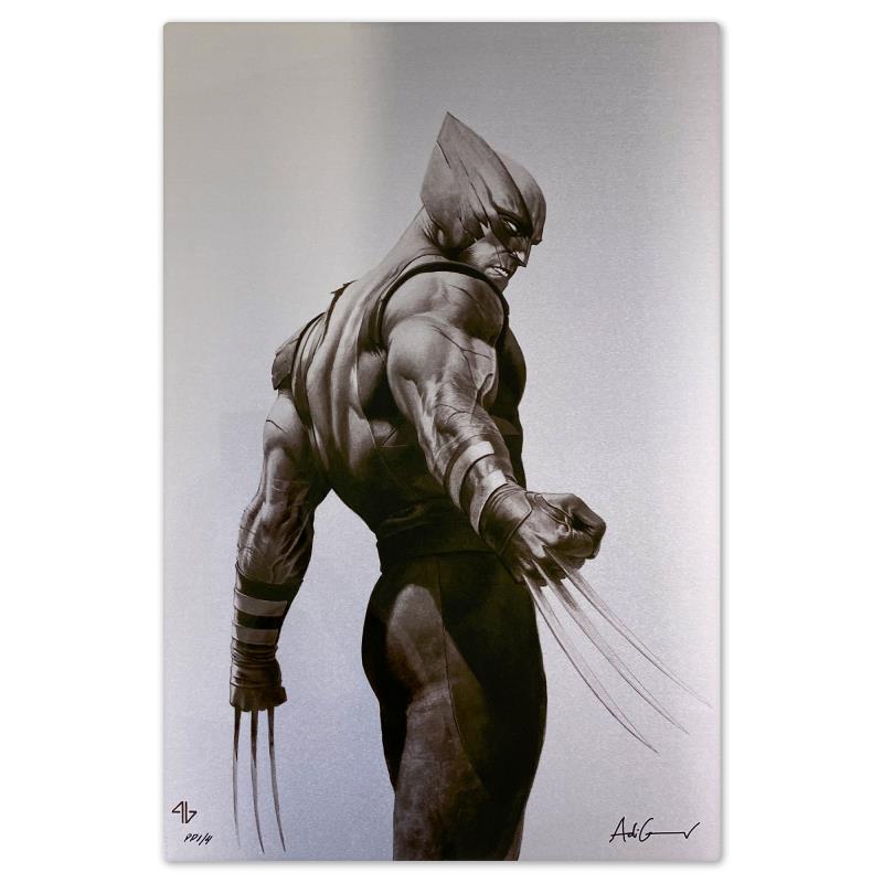 "Wolverine - Black & White Variant" is a limited edition giclee on aluminum from Marvel Comics and Adi Granov, PP numbered 1/4 and bearing the authorized signature of the artist. Includes Letter of Authenticity. Measures approx. 24" x 16" (image).