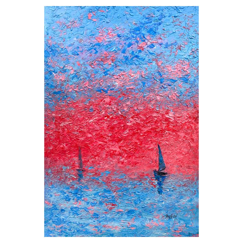 Canvas works are typically framed without plexi so that the vibrancy and interaction with light can be best appreciated.