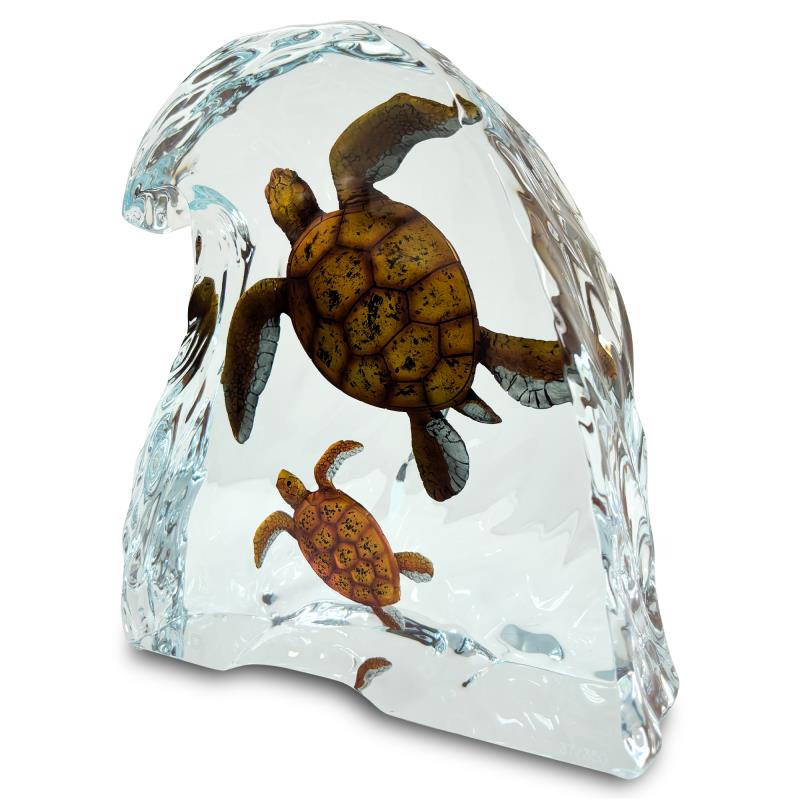 "Sea Turtles" is a limited edition lucite sculpture by Wyland, numbered and bearing Wyland's official signature. Includes Letter of Authenticity. Measures approx. 10" x 8" x 4".