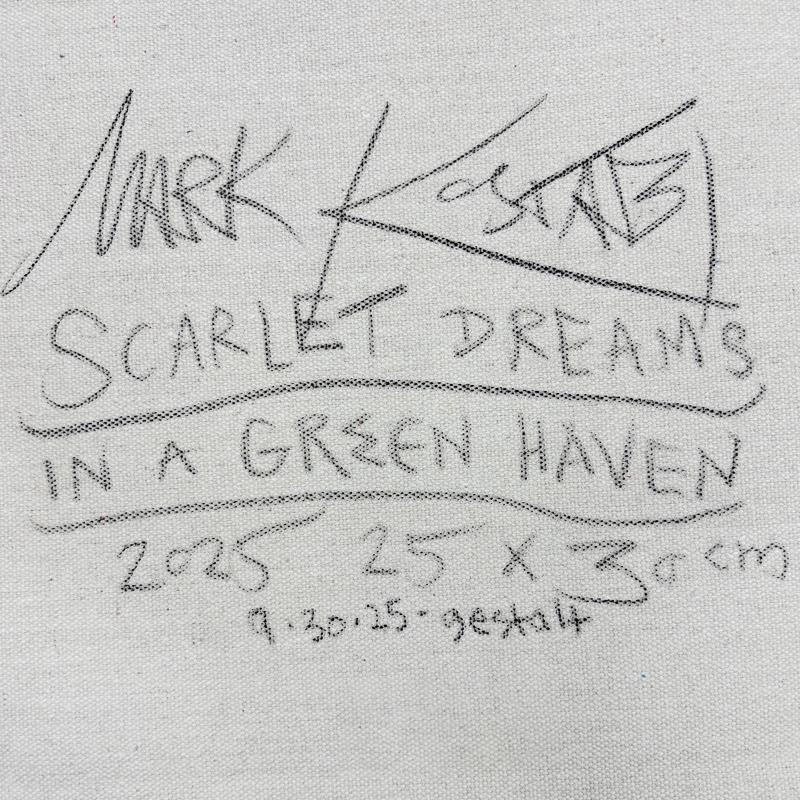 "Scarlet Dreams in a Green Haven" is an original oil painting on canvas by Mark Kostabi, hand signed by the artist. This piece comes custom framed. Includes Certificate of Authenticity. Measures approx. 20" x 22" (frame), 10" x 12" (image). This item requires special handling and may have a longer than usual turnaround.