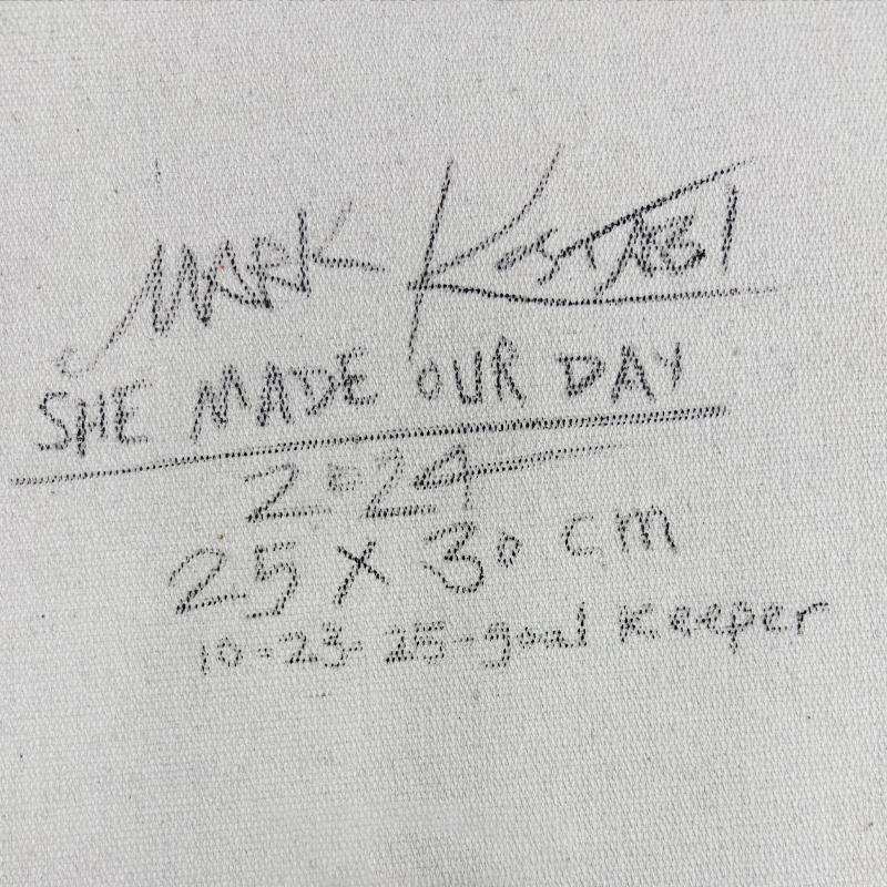 "She Made Our Day" is an original oil painting on canvas by Mark Kostabi, hand signed by the artist. This piece comes custom framed. Includes Certificate of Authenticity. Measures approx. 20" x 22" (frame), 10" x 12" (image). This item requires special handling and may have a longer than usual turnaround.