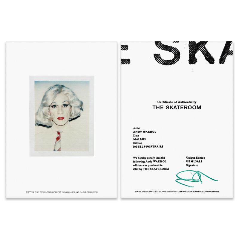 Self-Portrait (Grey) is a one-of-a-kind unique edition skateboard by Andy Warhol (1928-1987), bearing the plate signature inverso of the artist. This piece comes custom framed. This piece is from a unique edition in partnership with The Brant Foundation. Each edition within the collection has its own color hue and unique Andy Warhol polaroid photograph printed on the board inverso. This piece comes custom framed. Includes Certificate of Authenticity. Measures approx. 38" x 14.5" (frame), 32" x 8.5" (skateboard).This item requires special handling and may have longer than usual turnaround.