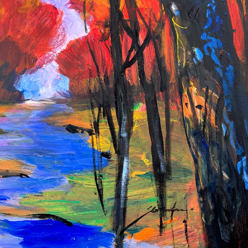 Canvas works are typically framed without plexi so that the vibrancy and interaction with light can be best appreciated.