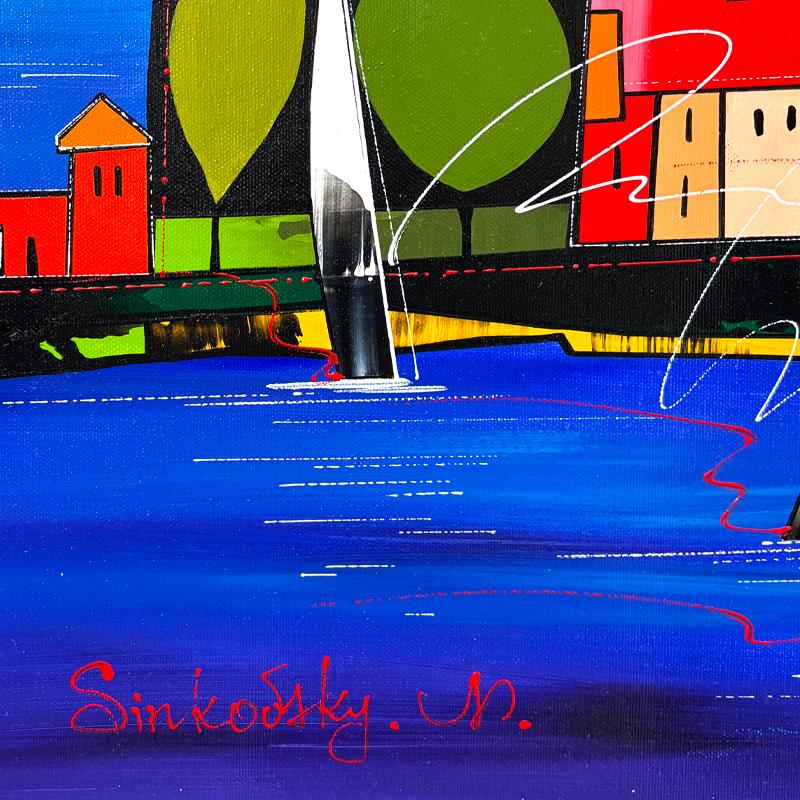 Born in 1959, in Kazakhstan, Natalia Sinkovsky finished her Master’s in Architecture in her homeland, where she also took drawing and painting courses. Sinkovsky immigrated to Israel with her family in 1995 and initially worked as an interior designer and architect, before expanding into painting professionally in 2002. Primarily painting in acrylic, Sinkovsky initiates her artistic process with an idea, rather than a predefined sketch, and applies layers of paint in thick application using a palette knife, before adding small graphic elements. She appreciates all art styles and movements, but is primarily inspired by abstract art and modern design, due in part to her background in architecture. Her sailboats series are influenced by her appreciation for the Expressionist, Baroque, and Cubist movements. In her artwork, Sinkovsky employs bright, cheerful colors to complement her optimistic outlook on life.