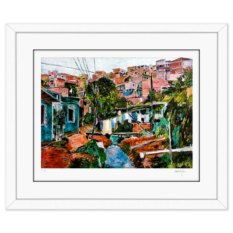 "Favela Villa Broncos" is a limited edition giclee on paper by Bob Dylan, TP numbered 1/2 and hand signed by the artist. This piece comes custom framed. Includes Letter of Authenticity. Measures approx. 29.5" x 34.5" (frame), 17.5" x 23.5" (image).