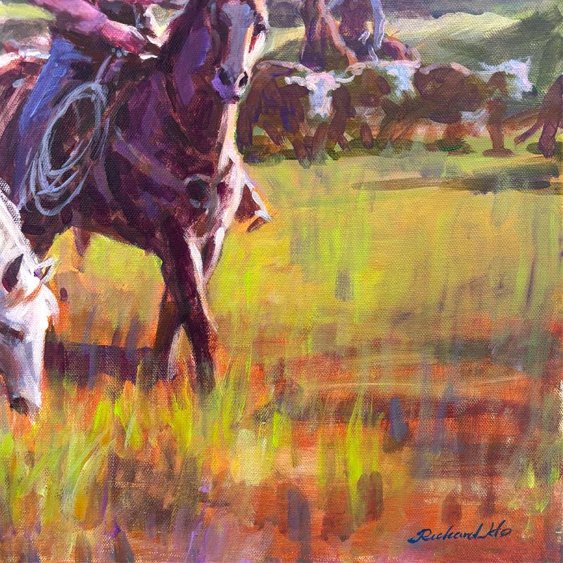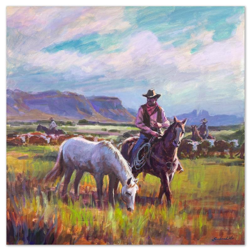 "Cattle Drive West" is an original acrylic painting on stretched canvas by Richard Ho, hand signed by the artist. Includes Letter of Authenticity. Measures approx. 24" x 24" (image).