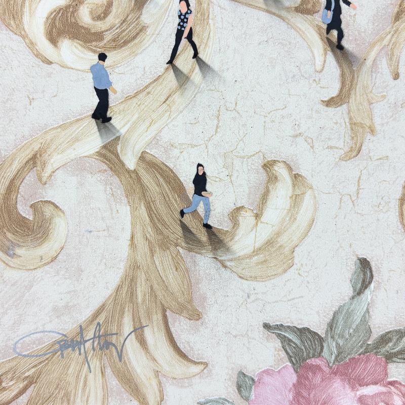 One of Alan’s notable series, "Populus," features intricate paintings of tiny people forming iconic images. This work showcases characters from diverse walks of life, demonstrating a broad spectrum of character and body types through brilliant use of posture and movement. The figures in Alan’s "Populus" series are meticulously arranged to create larger, recognizable images, highlighting his inventive approach and the thematic exploration of individual versus collective identity.