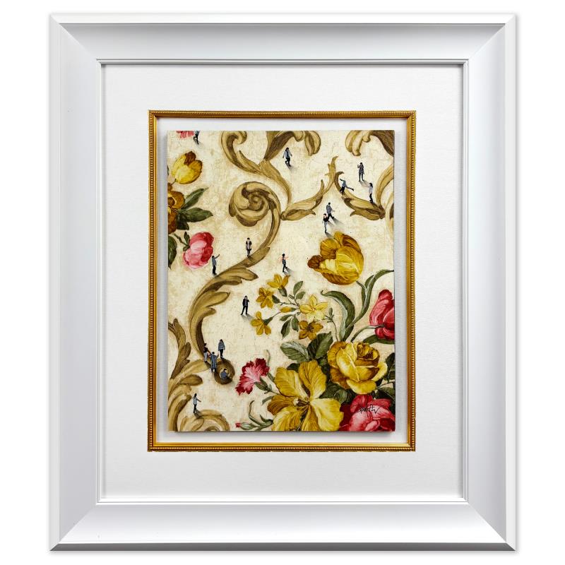 "Fragments (Populous)" is an original mixed media on vintage wallpaper by Craig Alan, hand signed by the artist. This piece comes custom framed. Includes Letter of Authenticity. Measures approx. 27" x 23" (frame), 16" x 12" (image).This item requires special handling and may have longer than usual turnaround.There may be minor perceived flaws but the art is in good condition and was received as is directly from the artist.