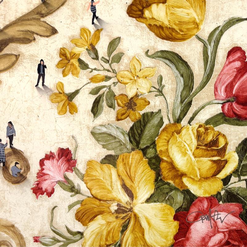 One of Alan’s notable series, "Populus," features intricate paintings of tiny people forming iconic images. This work showcases characters from diverse walks of life, demonstrating a broad spectrum of character and body types through brilliant use of posture and movement. The figures in Alan’s "Populus" series are meticulously arranged to create larger, recognizable images, highlighting his inventive approach and the thematic exploration of individual versus collective identity.