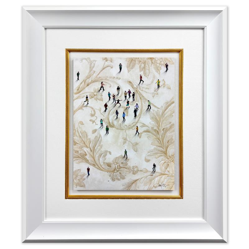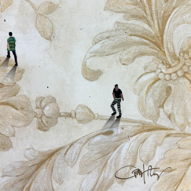 One of Alan’s notable series, "Populus," features intricate paintings of tiny people forming iconic images. This work showcases characters from diverse walks of life, demonstrating a broad spectrum of character and body types through brilliant use of posture and movement. The figures in Alan’s "Populus" series are meticulously arranged to create larger, recognizable images, highlighting his inventive approach and the thematic exploration of individual versus collective identity.