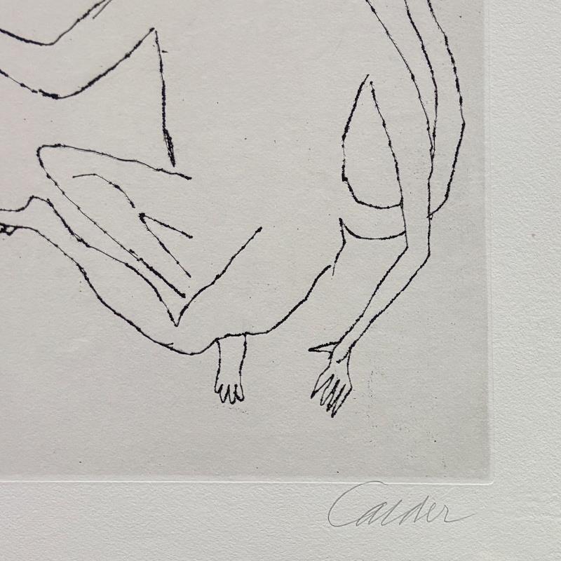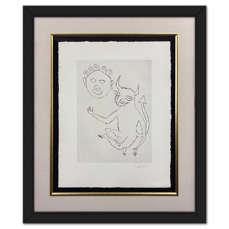 This is a etching on deckle edge paper by Alexander Calder (1898-1976), hand signed by the artist. This art comes from a limited edition portfolio of etchings featuring Calder illustrations created for the E.E. Cummings book, “Santa Claus”. The etchings were published in Paris in 1974. This piece comes custom framed. Includes Letter of Authenticity. Measures approx. 38.5" x 32.5" (frame), 18.5" x 13.5" (image).