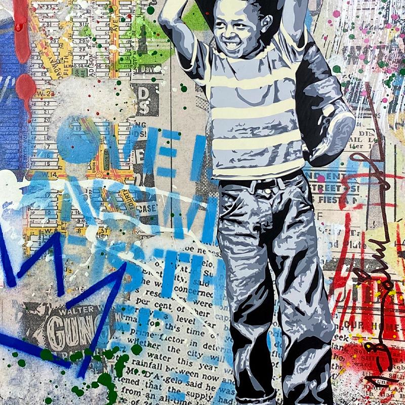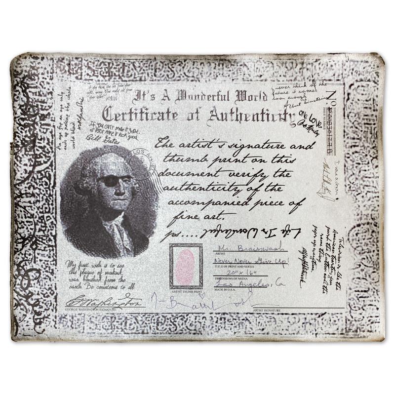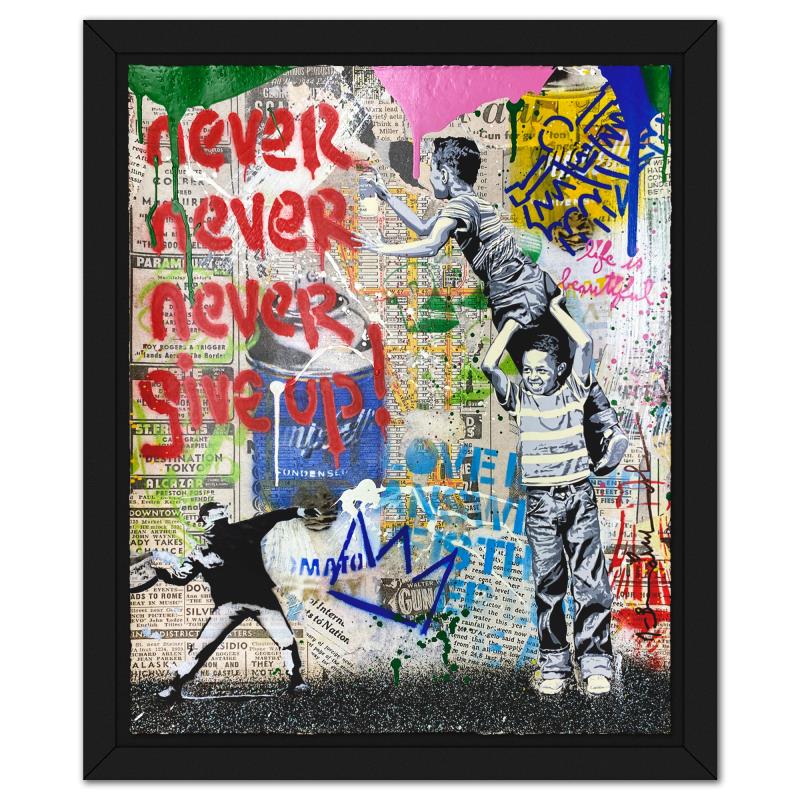 "Never, Never Give Up!" is a mixed media original on deckle edge paper by Mr Brainwash, Hand Signed and thumbprinted inverso by the artist. This piece comes framed. Includes Certificate of Authenticity. Measures approx. 24" x 20" (frame), 20" x 16" (image). This item requires special handling and may have longer than usual turnaround.