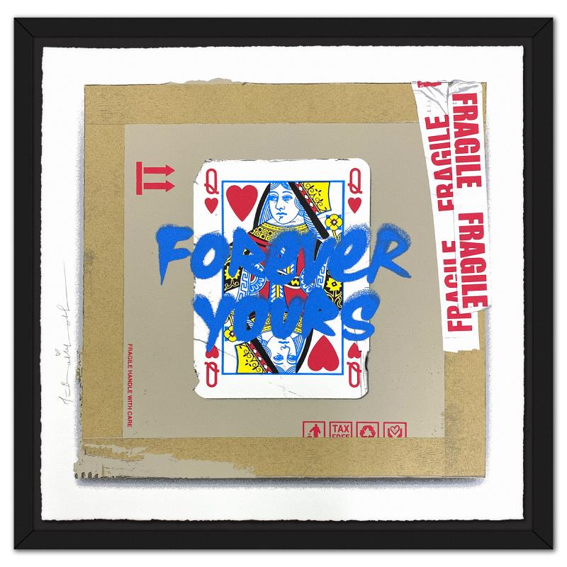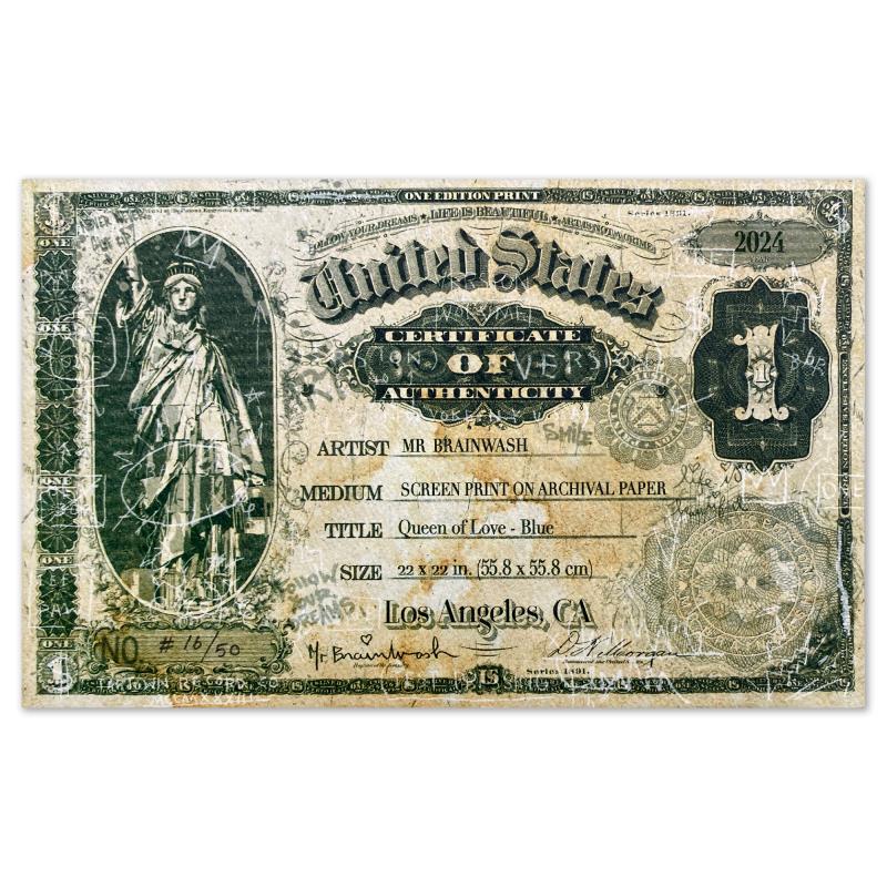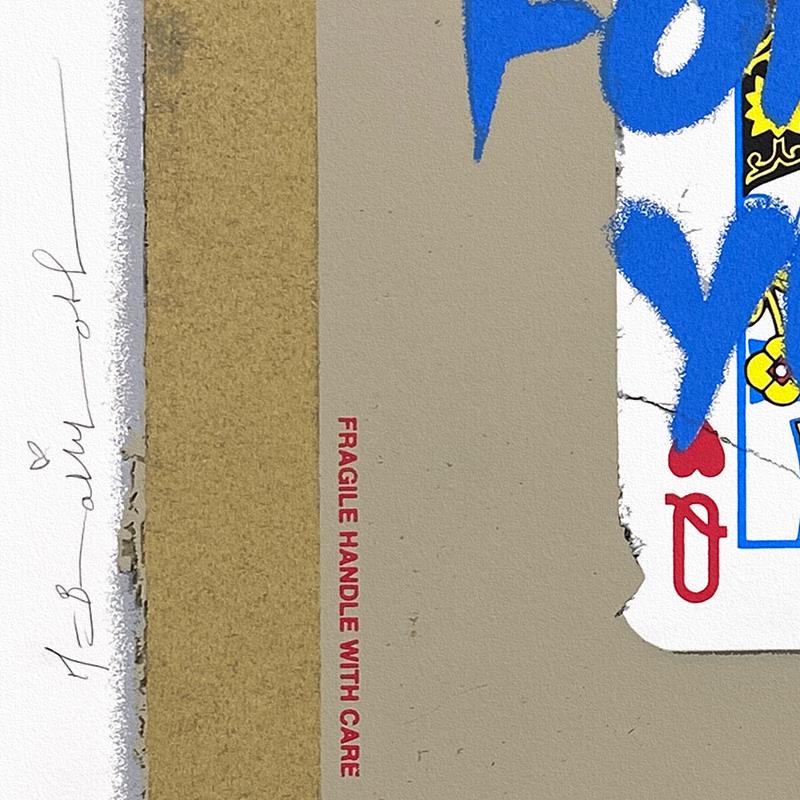 "Queen of Love - Blue" is a limited edition silkscreen on deckle edge paper by Mr Brainwash, numbered and hand signed by the artist. This piece comes framed. Includes Certificate of Authenticity. Measures approx. 26" x 26" (frame), 22" x 22" (image). This item requires special handling and may have longer than usual turnaround.