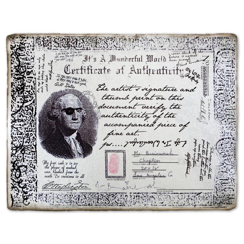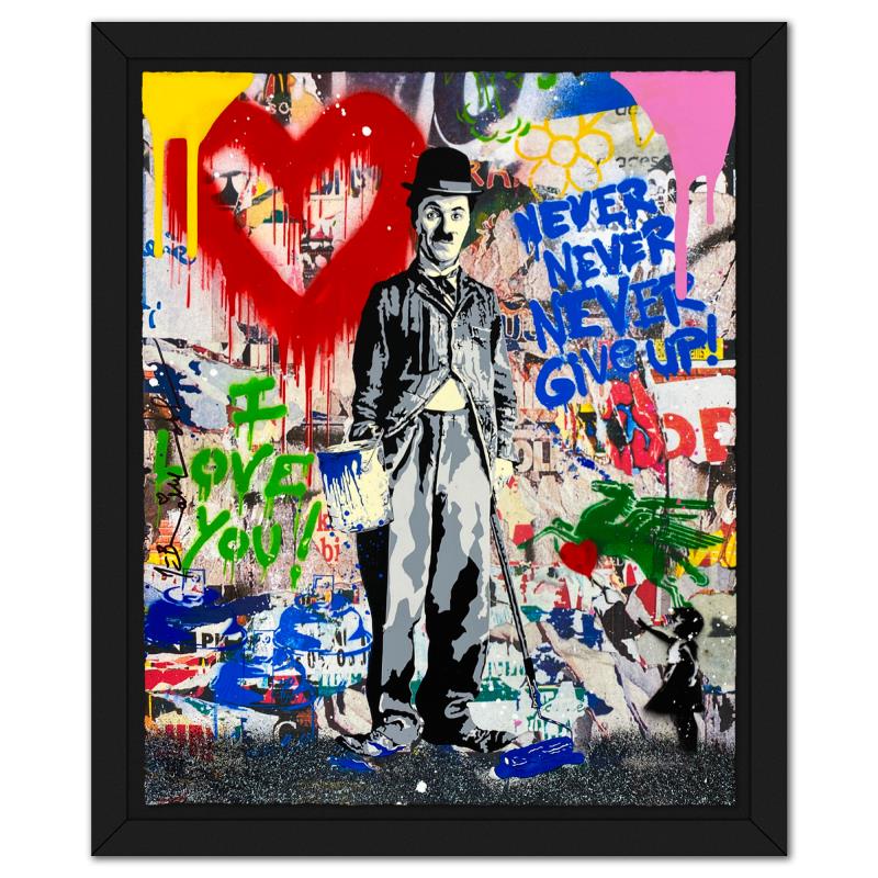 "Chaplin" is a mixed media original on deckle edge paper by Mr Brainwash, Hand Signed and thumbprinted inverso by the artist. This piece comes framed. Includes Certificate of Authenticity. Measures approx. 24" x 20" (frame), 20" x 16" (image). This item requires special handling and may have longer than usual turnaround.