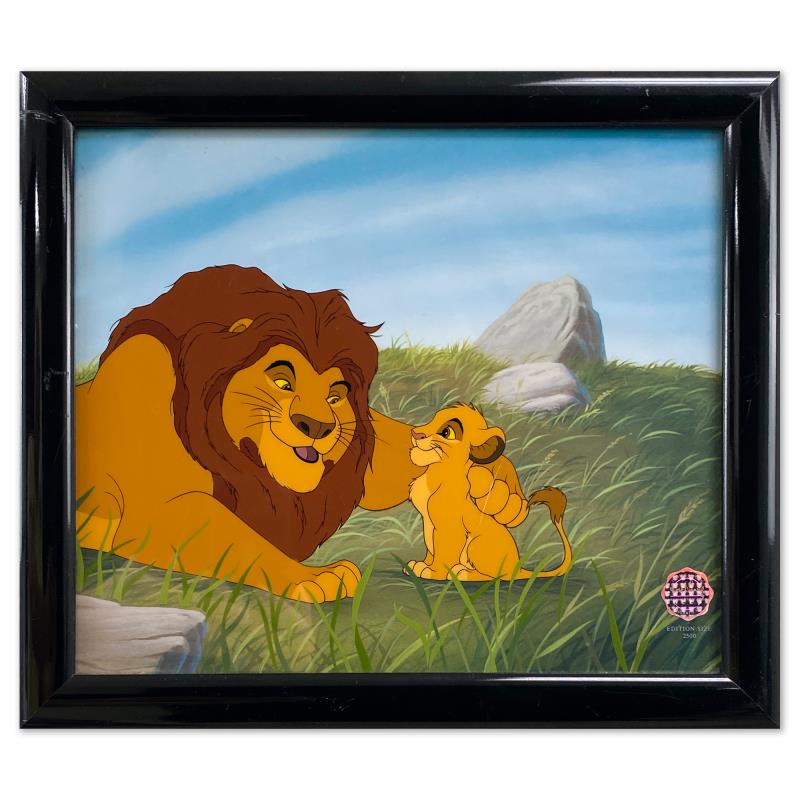 "The Lion King" is a limited edition sericel from Disney. This piece is from an edition size of 2500 but is not individually numbered. This piece is licensed by Disney and bears their offical seal. Includes Letter of Authenticity. Measures approx. 12.5" x 14.5" (frame), 10" x 12" (image). ** Please note: there is wear on the protective acrylic cover and frame. **