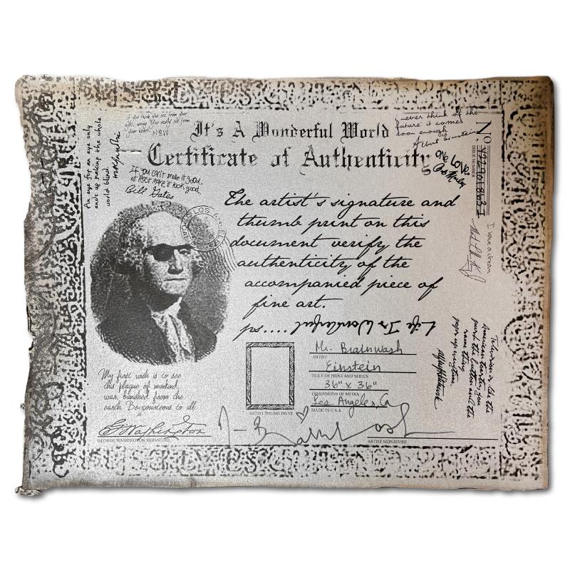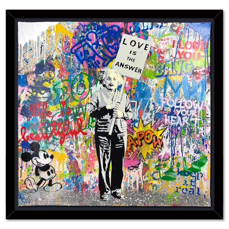 "Einstein" is a mixed media original on deckle edge paper by Mr. Brainwash, hand signed inverso and bearing the thumbprint of the artist. This piece comes custom framed. Includes Certificate of Authenticity. Measures approx. 40" x 40" (frame), 36" x 36" (image). This item requires special handling and may have a longer than usual turnaround.