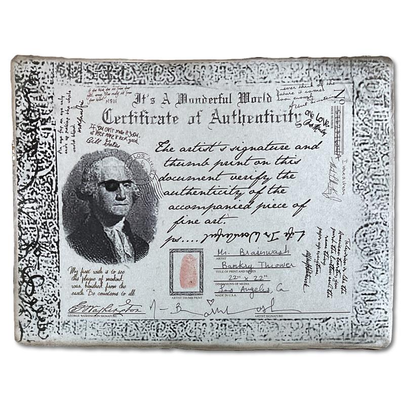 "Banksy Thrower" is a mixed media original on deckle edge paper by Mr. Brainwash, hand signed and bearing the thumbprint of the artist inverso. This piece comes custom framed. Includes Certificate of Authenticity. Measures approx. 26" x 26" (frame), 22" x 22" (image). This item requires special handling and may have a longer than usual turnaround.